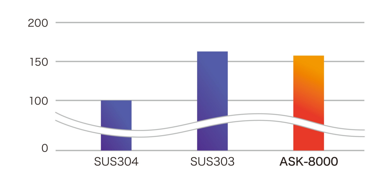 ASK-8000 は 硫黄を 0.12%以上含む成分設計で、切削加工性は ##SUS303 と SUS304 の中間(303 寄り)##のイメージです。
